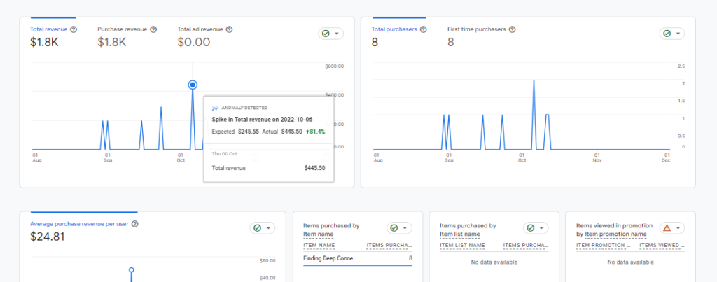 Finding Deep Connection earned $400 in revenue from its first 40 clicks in 1 week during soft launch: 5% conversion rate. She’s earned a lot since then, offering several course cycles and going on to launch a completely new one with a respectable influencer in her field and niche – the 3 Principles community created by Sydney Banks.